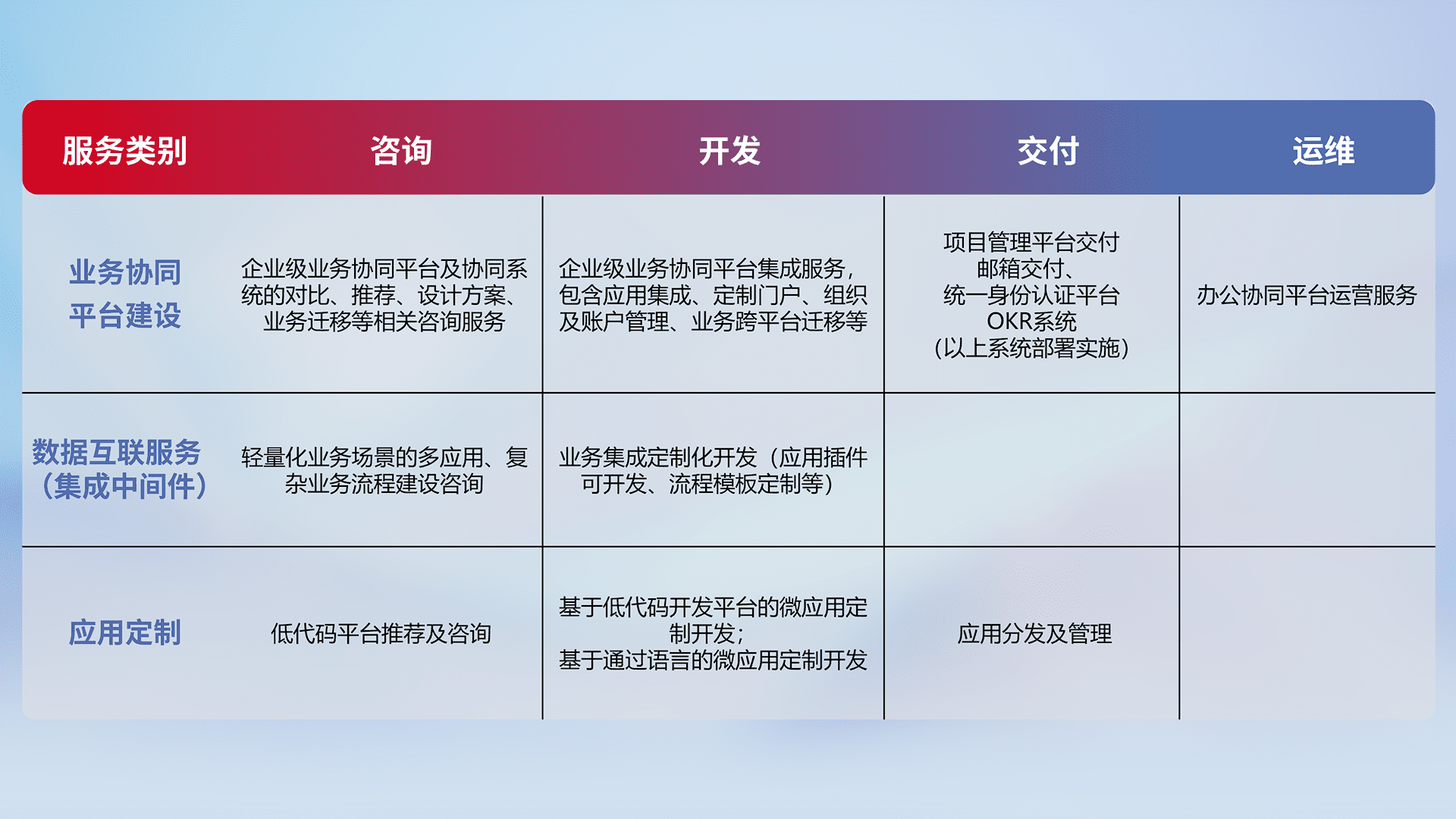 针对钉钉、、、企微、、、IDaas等平台级产品提供产品的规划、、、方案、、、交付、、、定制化开发等服务,,,实现如统一协同办公、、、智能客户服务、、、混合会议管理、、、智能数据查询、、、等业务场景,,,实现数字化转型。。